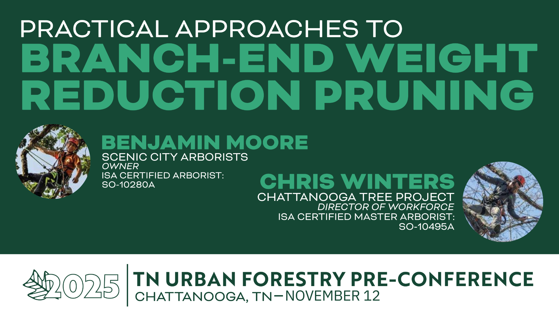 Join Chris Winters (ISA BCMA, Chattanooga Tree Project) and Benjamin Moore (ISA CA, Scenic City Arborists) at Reflection Riding Arboretum & Nature Center for an in-depth workshop exploring the science and practice of branch end weight reduction pruning on mature trees. The workshop will include a classroom session and field demonstration. Instruction will cover scientific applications and reasoning behind this practice, including decision making for health and aesthetics, branch attachments, the physics of lever arms, and pruning cut diameters. The field demonstration will include a walk though of methodologies, including climbing techniques for reaching branch ends, ergonomics, and decision making in the moment.